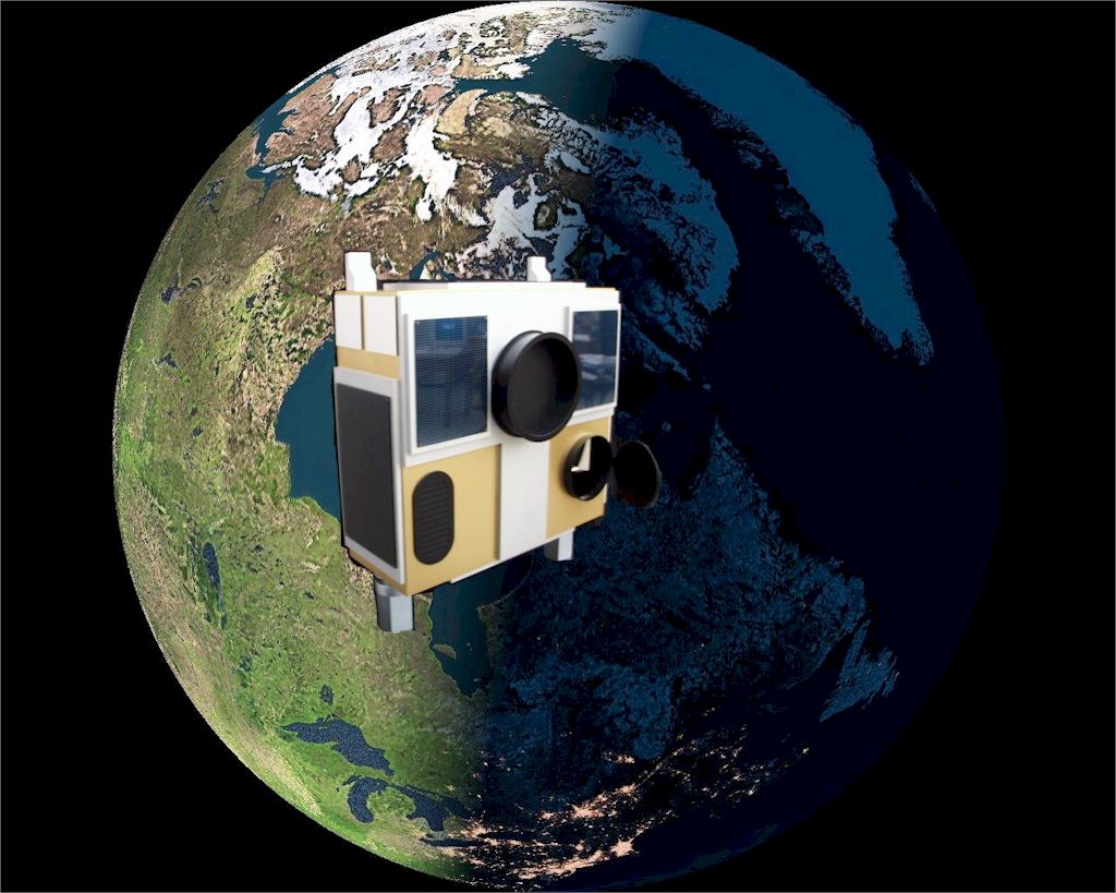 Rys. 1. Oto jak wygląda MOST. 15-cm teleskop jest umieszczony poziomo w dolnej części satelity i patrzy na niebo przez peryskop (45-stopniowe lustro) z otwartym tutaj zabezpieczeniem przeciwsłonecznym. Prostokąt z zaokrąglonymi końcami z lewej strony to element pasywnego chłodzenia CCD. Brzegi satelity i cała druga, oświetlona przez Słońce strona, są pokryte bateriami słonecznymi. Małe, wystające elementy to magnetometry systemu stabilizacji i anteny. Wyraźny, duży, czarny pierścień nie jest ciekawym elementem: to zaczep mocowania do rakiety podczas startu