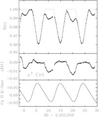 Rys. 8. Zmiany jasności Kappa1 Ceti obserwowane przez MOST (górna część). Po odjęciu wkładu jednej plamy rotującej z okresem 8,9 dni (część środkowa) pozostaje zmienność, którą można interpretować jako modulacje przez plamę rotującą z okresem 9,3 dni. Część najniższa rysunku podaje schematycznie zmiany aktywności chromosferycznej obserwowanej spektroskopowo 2 miesiące wcześniej