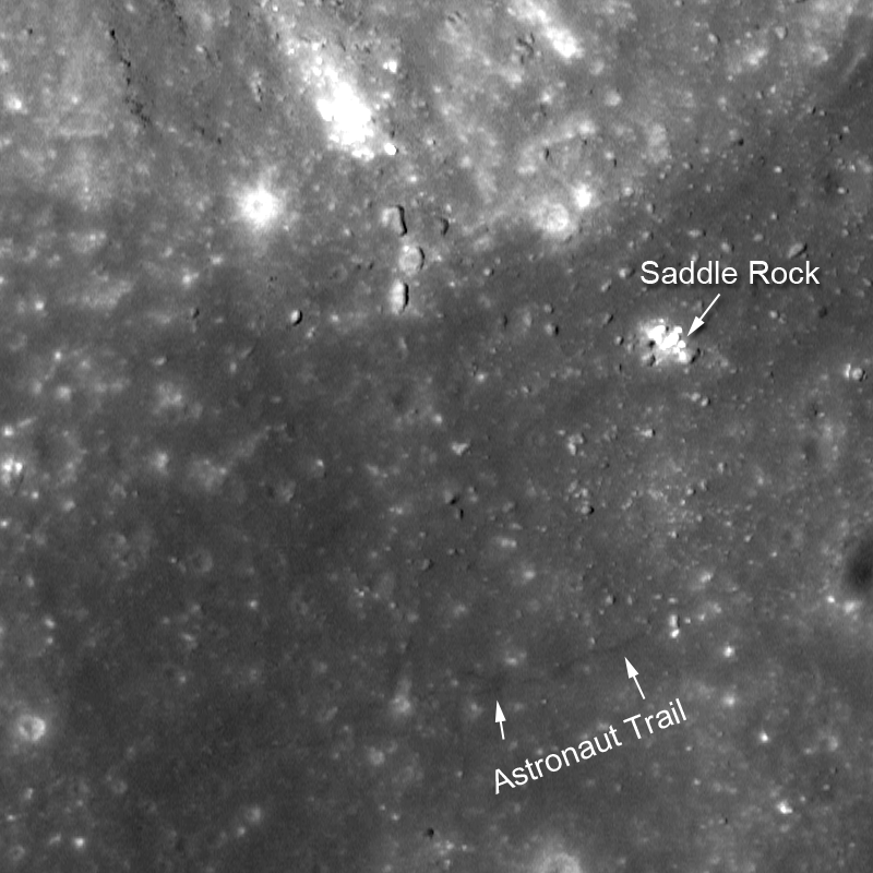 Apollo 14 - LROC NAC low orbit image of Cone crater, near the Apollo 14 landing site. Image is 400 meters wide, north is up, Sun is from the west (left) [NASA/GSFC/Arizona State University].Apollo 12Apollo 14 - Saddle rock, so close! Apollo 14 astronauts hiked up the flanks of Cone crater and got as far as Saddle rock before they had to turn back. A few tens of meters and what a view! LROC image 25 cm pixel scale, image 200 meters wide, north is up [NASA/GSFC/Arizona State University].Miejsce lądowania Apollo14Miejsce lądowania Apollo 17