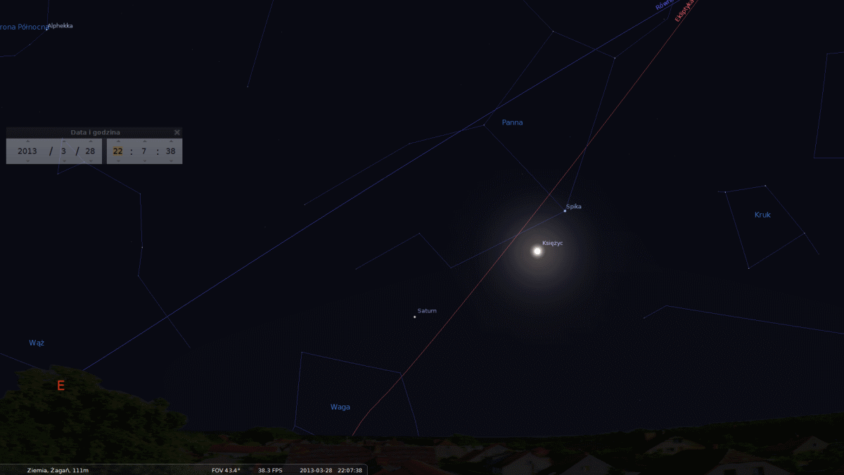 Spotkanie Spiscy Panny, Saturna i Księżyca w święta Wielkanocne 2013Około doby później dojdzie do kolejnej koniunkcji. "Księżyc i Saturn najbliżej siebie znajdą się o godzinie 19.13, ale ten czas jest także zbyt wczesny do obserwacji. W tym przypadku musimy poczekać do okolic godziny 23, kiedy to Srebrny Glob i planeta z pierścieniami będą świecić około 15 stopni nad południowo-wschodnim horyzontem. Dystans je dzielący w tym momencie wyniesie 4,5 stopnia" - zapowiedział dr Olech.