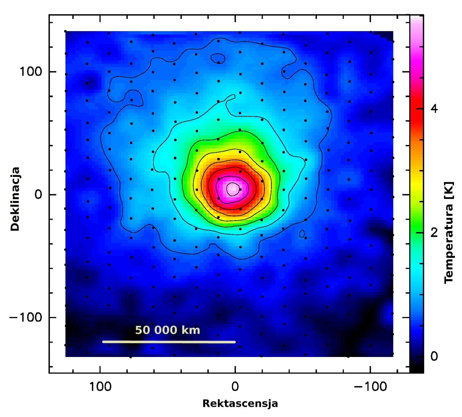Mapa atmosfery komety 10P/Tempel 2 otrzymana 19 lipca 2010 przy pomocy instrumentu HIFI z pokładu Kosmicznego teleskopu Herschel. Pokazany jest strumień emisji wody dla jej podstawowego przejścia rotacyjnego wyrażony poprzez temperaturę jasnościową mierzoną w kelwinach (źródło: S Szutowicz).Teleskop Herschel umożliwił odkrycie, że woda na komecie Hartley 2 charakteryzuje się takim samym stosunkiem deuteru do wodoru, jak woda w ziemskich oceanach. Bliskie przejście w listopadzie 2010 tej komety w pobliżu Ziemi pozwoliło na bardzo precyzyjną rejestrację jej promieniowania w dalekiej podczerwieni, czyli na pomiar emisji wody oraz ciężkiej wody w takim zakresie widma, który nie jest osiągalny przy użyciu teleskopów naziemnych. Ciężkiej wody jest bardzo niewiele w kometach, dlatego też strumień promieniowania jest niski i potrzebne są instrumenty o wysokiej czułości, takie jak HIFI na pokładzie Herschela. „Nasze pomiary pokazały, że w wodzie komety Hartley 2 na jeden atom deuteru przypada 6200 atomów wodoru, czyli tak jak w wodzie ziemskiej (druga grafika w galerii tego artykułu). Stąd wniosek, że nie tylko kolizje z planetoidami, ale także komety powinny być poważnie brane pod uwagę w dyskusji o obiektach, które dostarczały w przeszłości wodę na Ziemię” - mówi dr Szutowicz. Powstają dodatkowe pytania, na które trudno odpowiedzieć. Czy niska wartość D/H wskazuje na to, że kometa Hartley 2 uformowała się znacznie bliżej Słońca niż dotąd sądzono? Czy obowiązująca teoria na temat rozkładu deuteru z odległością od Słońca powinna ulec zmianie?