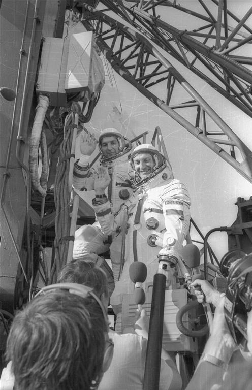 Kosmonauci przed wejściem do statku kosmicznego Sojuz 30 na dwie godziny przed odlotem. Nz. dowódca statku generał lotnictwa, kosmonauta radziecki Piotr Iljicz Klimuk (góra), polski kosmonauta Mirosław Hermaszewski. Fot. PAP/Tadeusz Zagoździński 27.06.1978.Przy dźwiękach przebojów Maryli Rodowicz i Anny German, z polską flagą, dziełem Mikołaja Kopernika i fotografią Edwarda Gierka startował 35 lat temu w swój kosmiczny lot Mirosław Hermaszewski - pierwszy i jedyny polski kosmonauta.