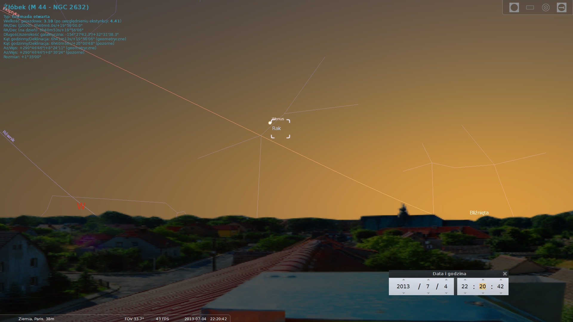 Zapowiada, że 3 lipca o godz. 21.16 naszego czasu w odległości tylko 4 minut kątowych od M44 znajdzie się jasna planeta Wenus. "O tej porze w Polsce jest jeszcze dość jasno, bo od zachodu Słońca dzieli nas tylko kwadrans. Dlatego na obserwacje najlepiej wyjść około godziny 21.45-22.00" - radzi naukowiec.