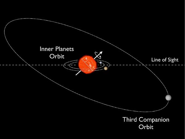 The angular momentum vectors show the axis of rotation for each component of Kepler-56: the star, the transiting planets, and the third body. Credit: LinkJednym z bardziej „egzotycznych” układów jest Kepler-56. W tym układzie wykryto trzy egzoplanety: dwa duże gazowe giganty i jednego „gorącego Neptuna”. To dość typowy wygląd obecnie znanych układów planetarnych – bardziej zaskakujący okazał się być kąt nachylenia płaszczyzn orbit tych egzoplanet względem płaszczyzny całego układu, wyznaczonej przez równik gwiazdy macierzystej. W przypadku omawianego układu Kepler-56 ten kąt nachylenia wynosi aż 45 stopni dla dwóch obiektów, co jest zupełnie niespodziewaną wartością.