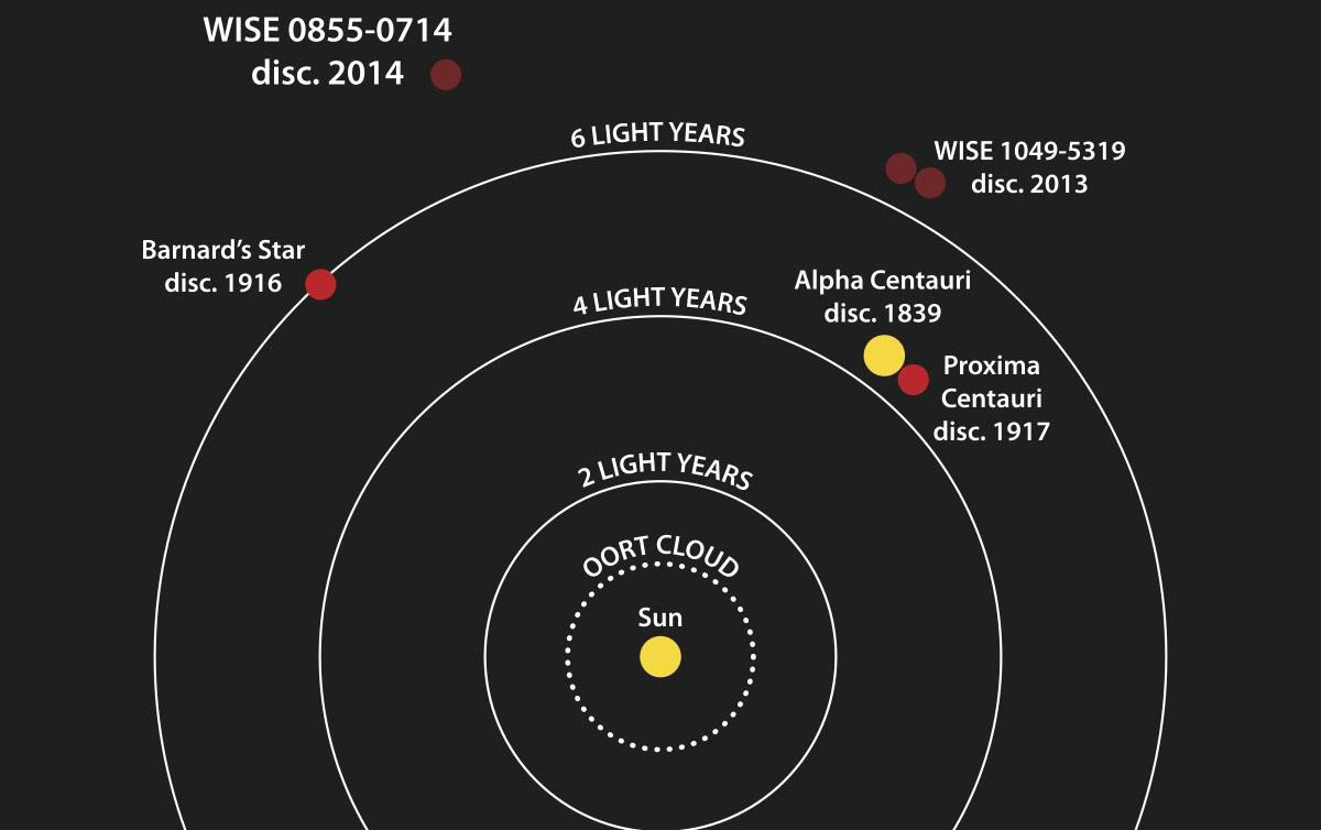 This image shows the locations of the star systems closest to our Sun. Image credit: NASA / Penn State University.Najnowsze odkrycie w naszym sąsiedztwie to obiekt o oznaczeniu WISE J085510.83-071442.5 (skrótowe oznaczenie: WISE 0855–0714). Jest to brązowy karzeł, znajdujący się w odległości zaledwie 7,2 lat świetlnych od Układu Słonecznego. Jest to czwarty najbliższy obiekt od nas.
