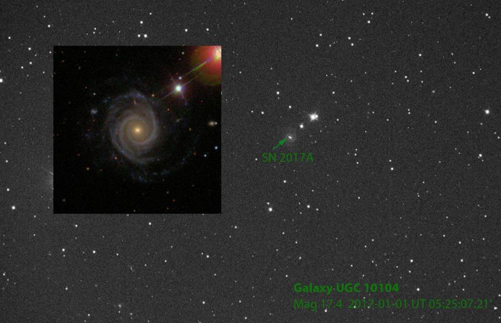 Supernowa SN 2017A odkryta przez Polaków. Fot. Grzegorz Duszanowicz i Michał Żołnowski / SLOAN. Odkryta przez dwóch polskich miłośników astronomii supernowa - oznaczona AT 2017A - jest pierwszym obiektem tego typu odkrytym w roku 2017. Informację o jej znalezieniu podała Grupa Robocza ds. Supernowych działająca w ramach Międzynarodowej Unii Astronomicznej. Gdy w Polsce kończyły się zabawy sylwestrowe, nad ranem 1 stycznia dwóch miłośników astronomii z Polski uruchomiło swój automatyczny teleskop w prywatnym obserwatorium Ratinga we Włoszech. Teleskop wykonał serię zdjęć; supernową udało się dostrzec na ostatnim z nich.