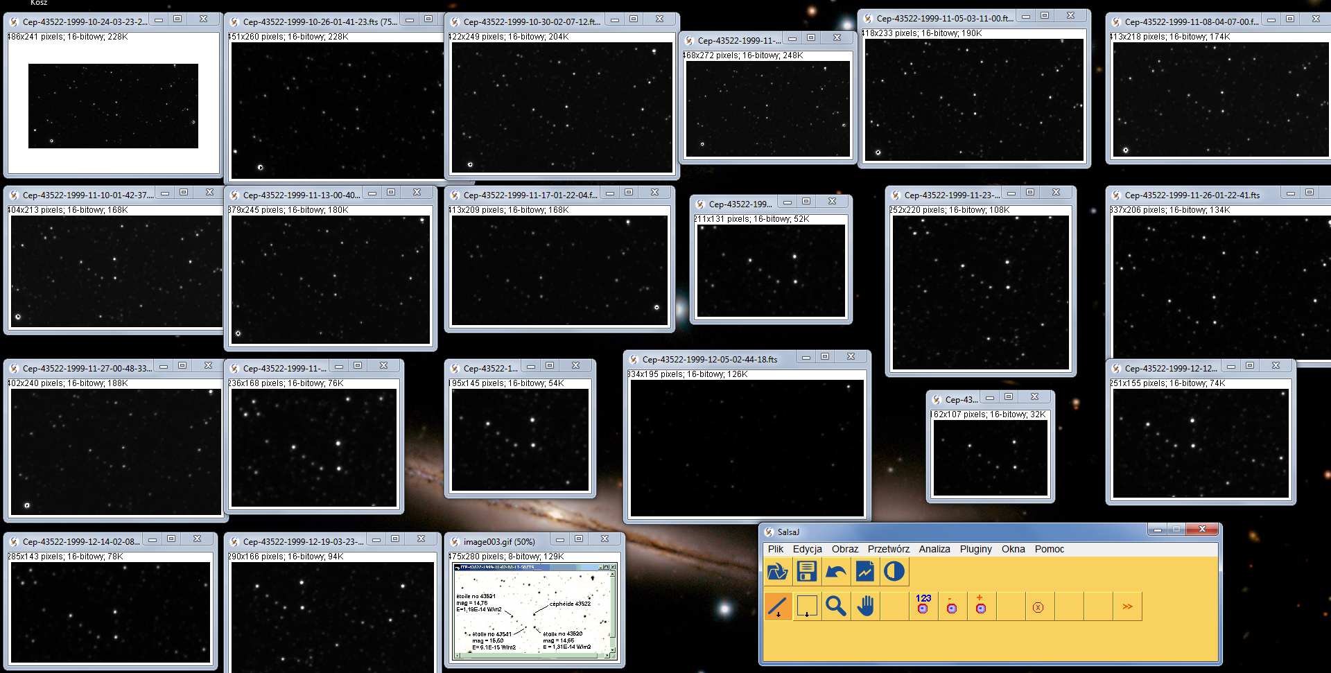 Zakładamy, że masz już zainstalowany program SalsaJ. Ruchom go i z menu /plik/otwórz i otwórz zdjęcia z katalogu cefeidy. Teraz wybierz z menu Okna/sąsiadująco co rozmieści je tak byś widział wszystkie na raz – jeśli tylko rozmiar ekranu na to pozwoli, niektóre zostaną zmniejszone.
