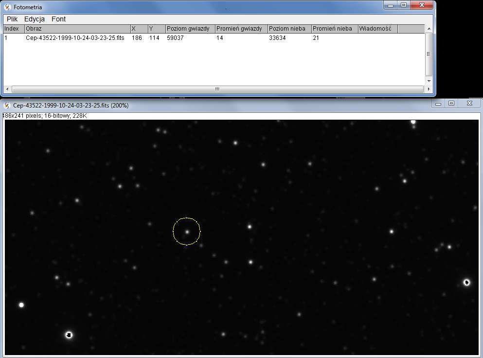 Kiedy wybierzesz jeden plik FITS ze zdjęciem nieba, klikniesz na obraz gwiazdy, którą masz zmierzyć, w oknie tym pojawi się wynik ze zliczeniem danych z pliku – wiersz liczb. Na zdjęciu pojawi się krążek wewnątrz którego robione są zliczenia. Część tego krążka to obszar gwiazdy, a część to obszar nieba. O tym jaki to obszar mówią nam liczby w okienku pomiarów fotometrii - w kolumnie obszar nieba, obszar gwiazdy. Zaraz pokażemy jak zmienić te parametry i dlaczego warto to zrobić. Wyniki fotometrii można usuwać z okienka fotometria. W oknie fotometria zaznacz myszą linię z wynikami i wybierz edycja/usuń linia wyników zostanie usunięta.
