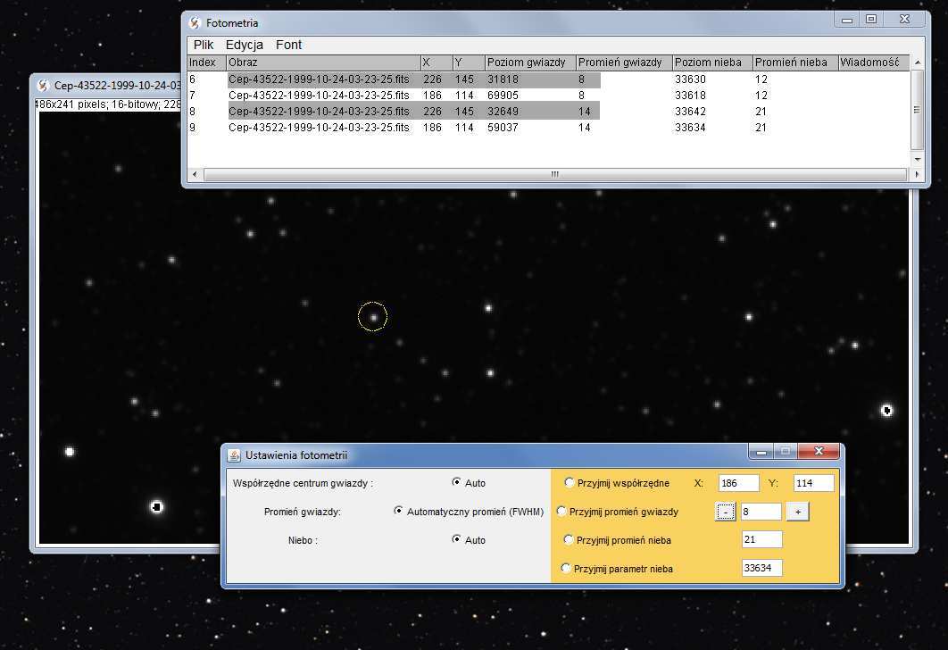 W ramach ostatnich zajęć wykorzystaliśmy przygotowane dane i przeprowadziliśmy pomiary jasności gwiazd z materiału fotograficznego. Poniżej pokażemy jak można to wykonać aby inni mogli z tego skorzystać nie mając wcześniej doświadczenia z oprogramowaniem do tego typu pomiarów.