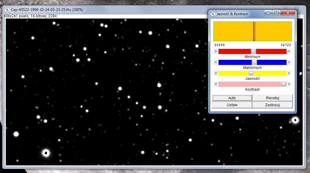 Jeśli na obrazie nie widać gwiazd lub jest ich zbyt mało wybierz obraz/dostosuj/jasność-kontrast a w nowym oknie kliknij Auto. Można też ręcznie regulować poszczególne suwaki.