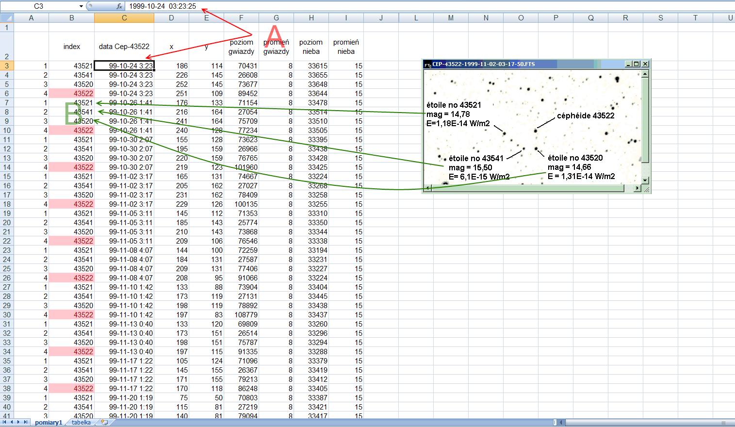 Po umieszczeniu danych w arkuszu otrzymamy tabele z 80 pomiarami (20 zdjęć po 4 pomiary). Aby można te dane przetwarzać z funkcjami arkusza warto zmodyfikować nieco jego zawartość, a przy okazji poznać jakie to narzędzie ma możliwości. W kolumnie index znajdowały się numery pomiarów, a tu zostały zmienione na oznaczenia konkretnych gwiazd (B). A wiersze z cefeidą oznaczono jeszcze kolorem dla wyróżnienia grup danych – łatwiej się poruszać po tym zbiorze liczb. Kolumna C zawierała nazwy plików, na których dokonywaliśmy pomiaru fotometrycznego. Tu zmieniono wpisy w wierszach na daty zdjęć. Arkusz ma swoje wymagania co do tego formatu danych. Aby potem skutecznie działały na nim nasze formuły musimy dokonać zmian tak jak pokazują to strzałki od litery A.