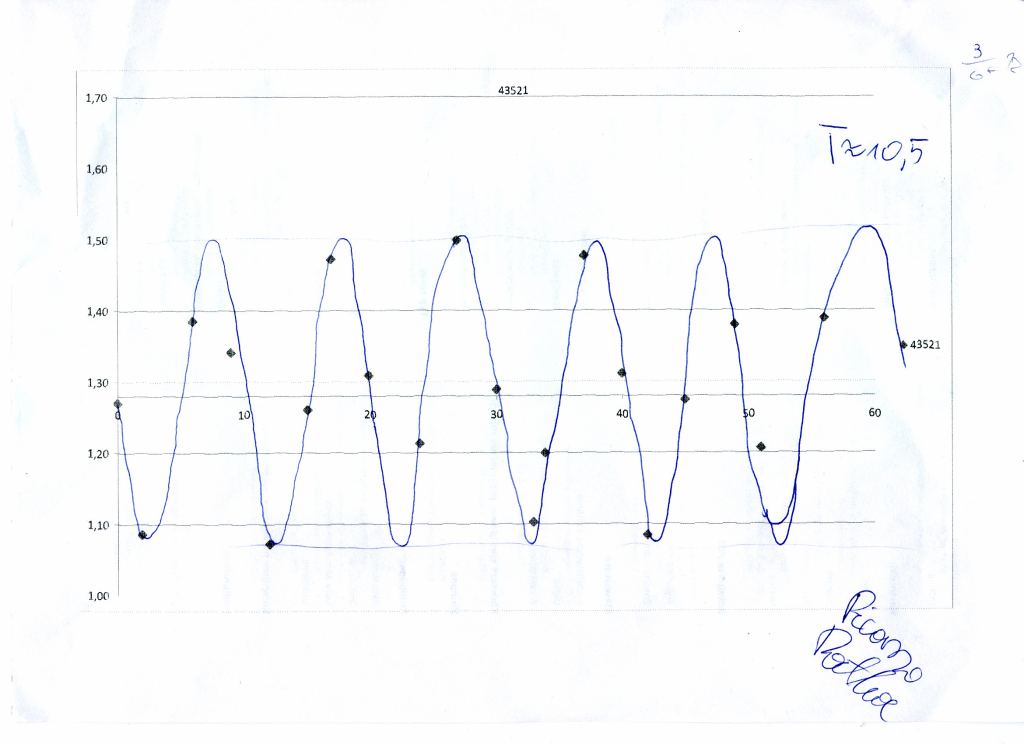 - Ilość pomiarów jest zdecydowanie zbyt mała do precyzyjnego badania krzywej zmian jasności. Z innych danych wiemy, że jest ona piłokształtna, a tu analizujemy krzywą sinusoidalną. Modelowanie niewielkich zmian wartości parametrów mających bezpośredni wpływ na wynik odległości nie mają znaczącego wpływu. Błąd pomiarowy musi leżeć gdzieś wcześniej i stąd tak znacząca odchyłka. Taka cecha pomiaru była złożona przez twórców ćwiczenia już na początku. A może przy obecnych pomiarach uwzględniono też inne efekty.
