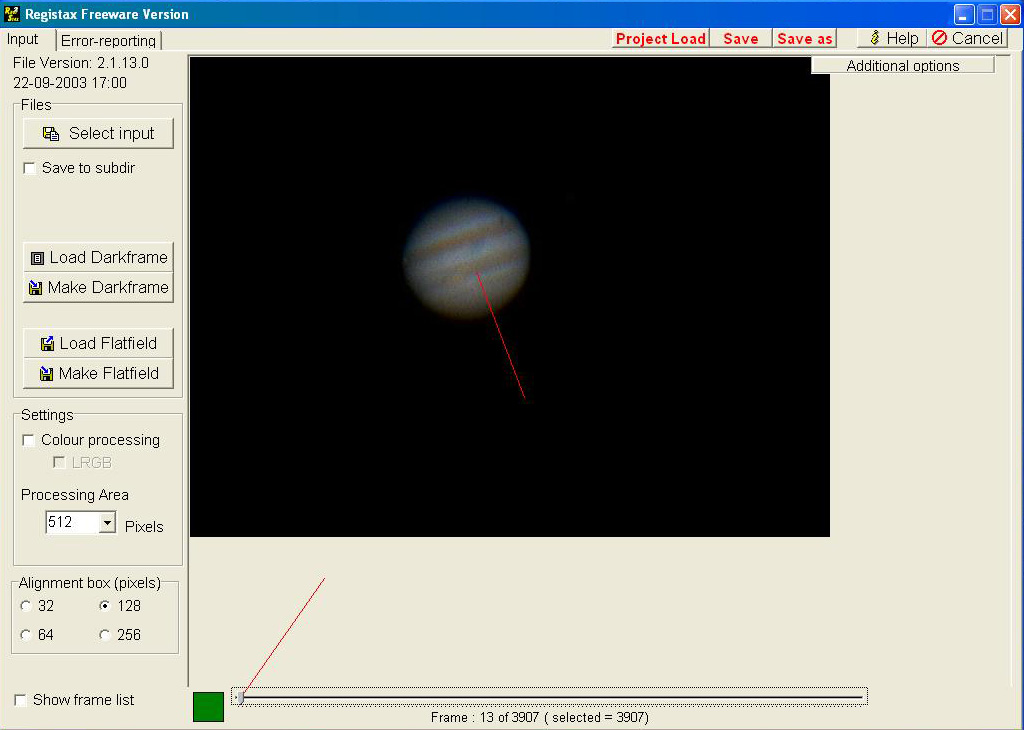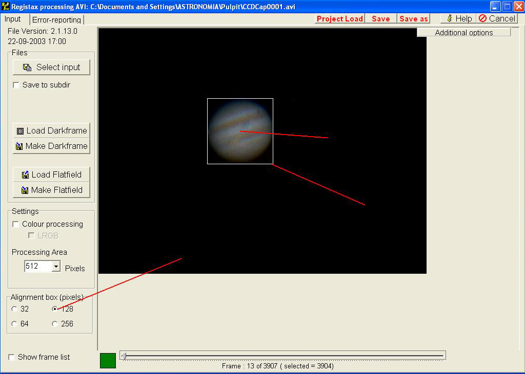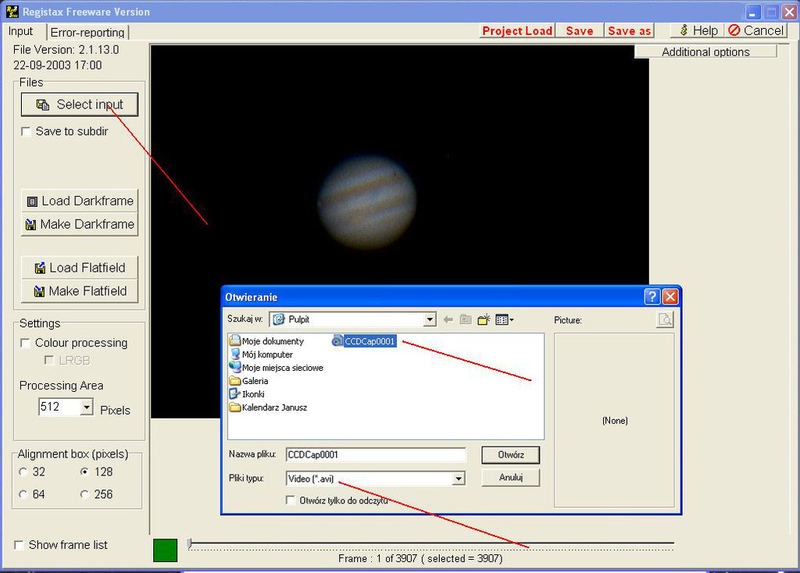 2) Select Imput zaznaczamy plik Video Avi zawierający naszą sesję z Jowiszem.