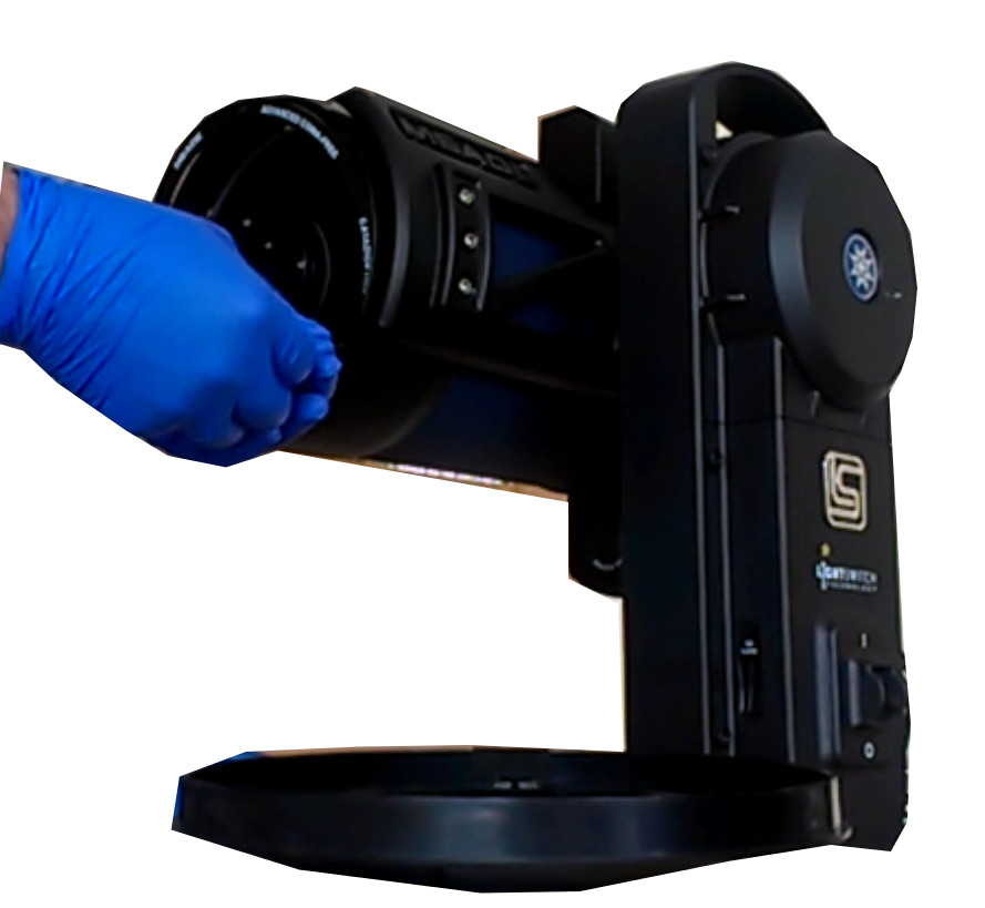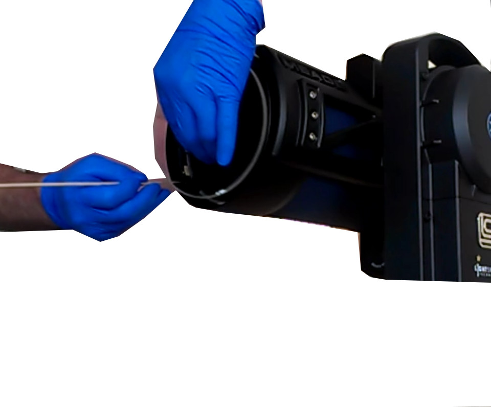 W wyciąg teleskopu wkładamy kolimator laserowy. Kontrujemy go i nie ma tu znaczenia gdzie nasza plamka kontrolna znajdzie się na ekranie. Do zakończenia prac nie wyjmiemy go z tego położenia. Mamy bowiem zając się jedynie optyką lustra wtórnego i płyty korekcyjnej.