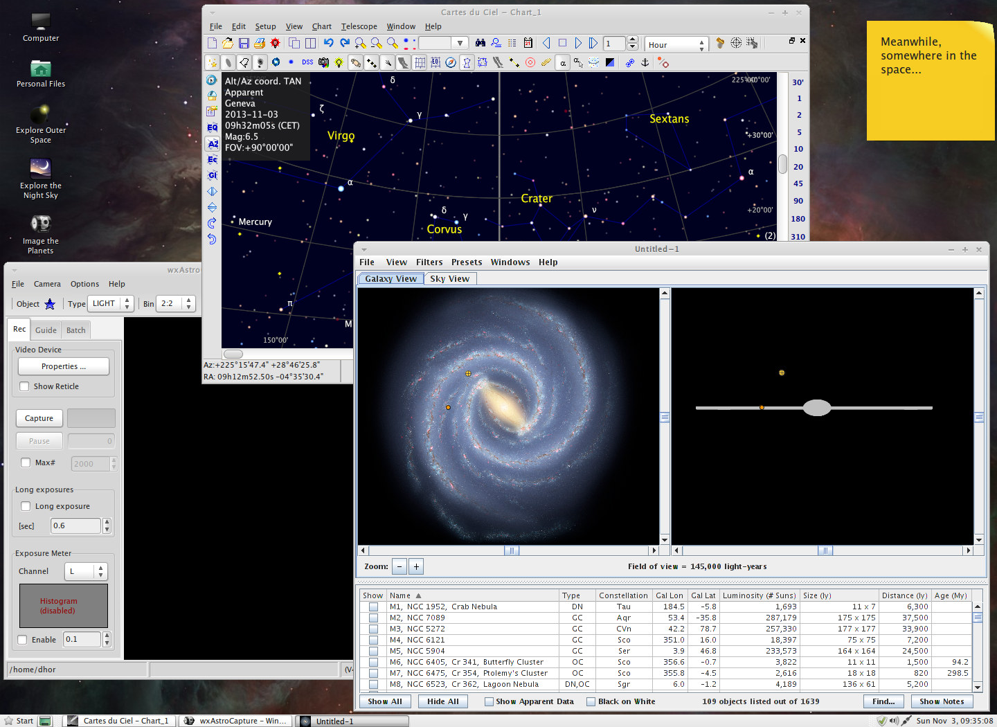 Rodowód Disto Astro 1.02 ze strony technicznej wywodzi się od dystrybucji Mint 13 Maya. Tym samym spowinowacanie z Ubuntu LTS zapewnia długoterminowe wsparcie. Całość opiera się na komponentach znanych z Minta, zatem na pulpicie ujrzymy środowisko MATE 1.4.2, Firefox 25, LibreOffice 4.0.4, GIMP 2.8.6, VLC 2.0.3 a nad całością czuwa kernel 3.2.0-49. Lecz to są komponenty, które może mieć każdy, a kwintesencją Distro Astro są jednak programy astronomiczne – i tu nie obędzie się bez długiej wyliczanki, nawet jeżeli wielu tak samo zielonym odbiorcom jak ja ona wiele nie powie. Ale przynajmniej w towarzystwie będzie można już żywiej zareagować na zaczepkę – ‚Linux i astronomia, dobre sobie’.