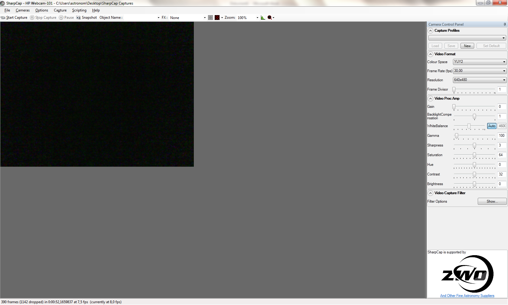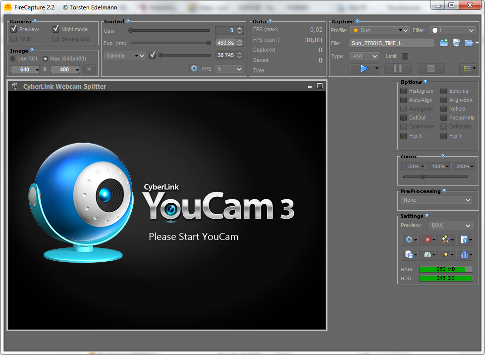 Po podłączeniu kamerki do teleskopu, skierowaniu go na nasz obiekt, Księżyc, podłączeniu przewodu od kamery do komputera uruchamiamy program do rejestracji obrazu. W zasadzie wystarczy każdy program, który z naszej kamery nagra filmik. Ale warto wykorzystać specjalne do astrofotografii przygotowane programy. Polecam dwa z nich – bezpłatne. Jeden to Fire Capture a drugi to Sharp Cap. Co one nam dają takie czego nie ma zwykły program? Jest co najmniej kilka funkcji wartych uwagi. Nazywają automatycznie pliki wg tego co fotografujemy. Z menu wybieramy nazwę fotografowanego obiektu a program dodaje np. datę, godzinę, filtry, itd. Oraz tworzy dla danego dnia rejestracji oddzielny katalog. Szybko się bowiem przekonasz, że ilość materiału rośnie i trudno się już zorientować co kiedy zarejestrowaliśmy. Oba programy mają te funkcje inaczej dostępne, ale są. Możemy sterować wzmocnieniem sygnału tzw. Gain. Większy gain to jaśniejszy obraz ale i większy szum. Możemy sterować tzw. Migawką, Czyli czasem ekspozycji. Dłuższy czas to więcej detali ale i większy szum na zdjęciach. Musimy tak dobrać te parametry aby powstał jak najlepszy materiał.