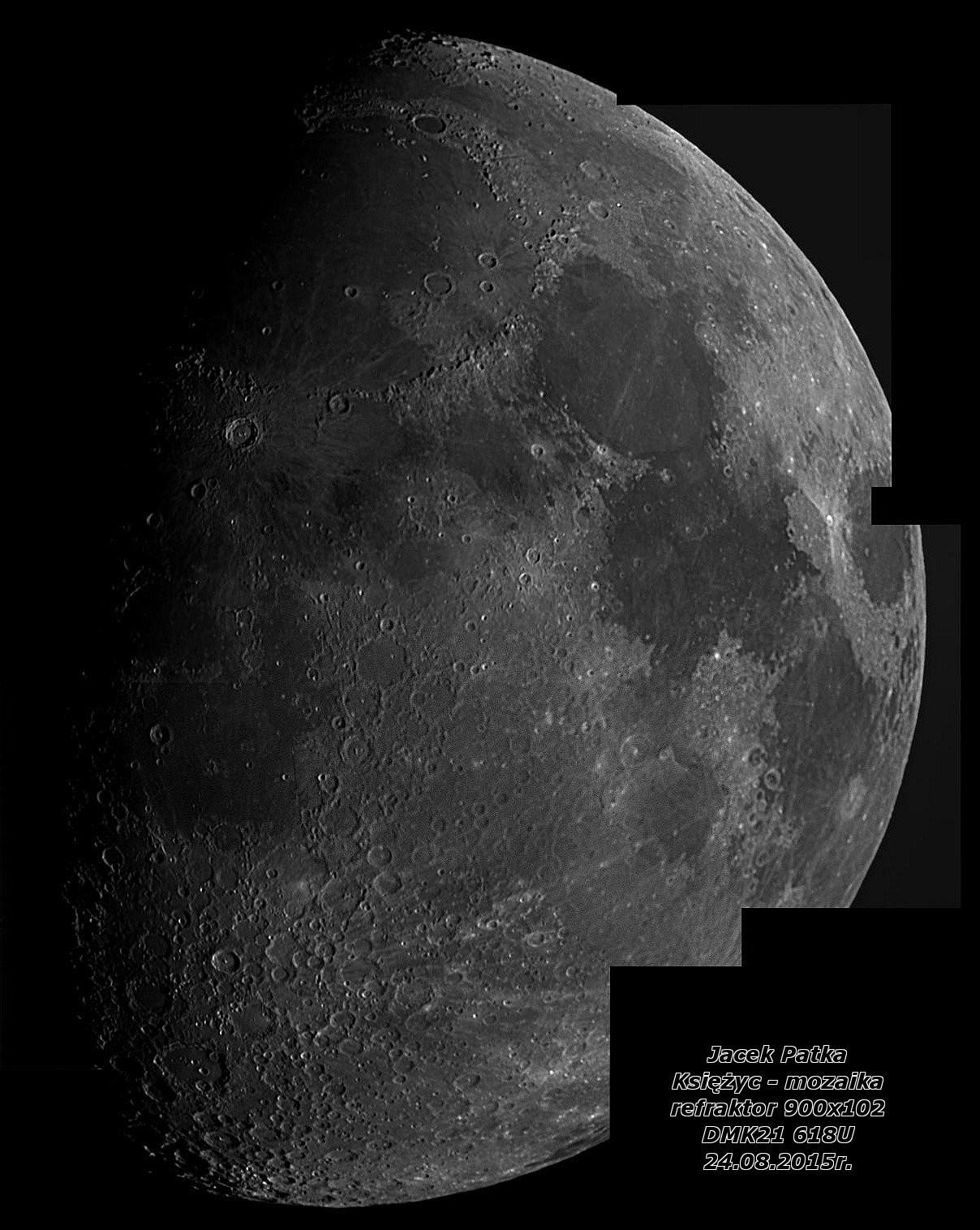 Tak powstał obraz Księżyca tu widoczny. Z tą równicą, że w kadrze każdego filmu był widoczny tylko fragment tego całości. Trzeba więc było dokonać obróbki kilku nagranych filmów a następnie połączyć je w całość. To tzw. mozaika. Aby ją złożyć można użyć innego programu, już wcale nie związanego z astrofotografią, ale również bezpłatnego. Ten program to Image Coposite Editor (strona programu). Normalnie wykorzystywany do składania panoramy. Składa on również mozaiki. I w tym naszym przypadku spisze się wspaniale.