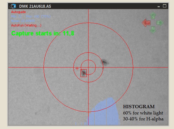 Wyreguluj ekspozycję tak, że histogram jest wypełniony w około 30-40% dla Ha i 70% dla światła białego. Ustawić krótki czas ekspozycji i upewnić się, że kamera działa przy maksymalnej prędkości klatek (dla DMK 30 kl./s). Ustaw współczynnik gamma do 100 (absolutnie konieczne!) Zresetować jasność, kontrast i inne ustawienia. Chcemy, aby nasze dane były tak surowe i liniowe, jak to możliwe.