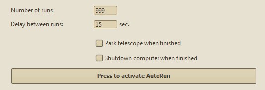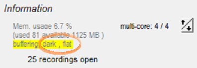 Po zakończeniu sesji np. godzinnej, trzeba wykonać ciemne klatki – tzw. DARK. Zasłaniamy teleskop kapturkiem i obracamy go od Słońca. Bez zmiany parametrów ustawienia ekspozycji wykonujemy fotografię szumu matrycy. Czyli dokładnie taka samą ekspozycję np. 20s ale z zasłoniętym teleskopem. Program zarejestruje tylko co wygeneruje rozgrzana matryca CCD. Warto odpowiednio opisać ten obraz (DARK).