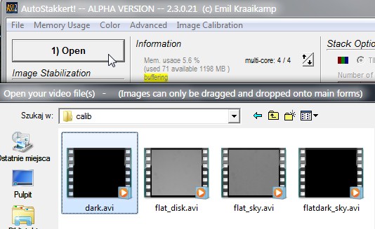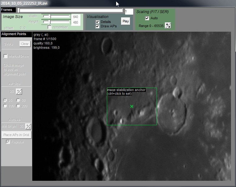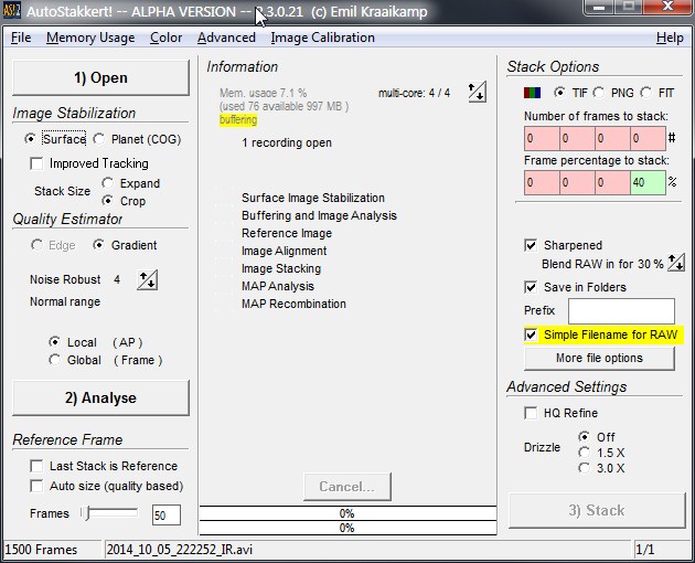Mamy zamiar użyć AutoStakkert do przetwarzania (AutoStakkert ). Ja polecam najnowszą wersję beta. Jesteś wolny i możesz korzystać z innego oprogramowania, które lubisz. Jednak AutoStakkert jest bardzo wygodne, jeśli chodzi o przetwarzanie dużych zbiorów danych. Również AutoStakkert jest w stanie otworzyć pliki SER, a także AVI plików skompresowanych kodekiem bezstratnym UT-Video.