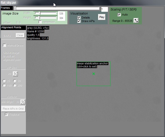 Aby poprawnie wyrównać obrazy z kadrów filmu trzeba wskazać programowi tzw. Kotwice. W tym celu klikamy w prawym oknie myszą wybierając charakterystyczne miejsca na obrazie jakimi ma kierować się program składając nasz stos klatek. Jest to miejsce w którym widać jak ważne jest odjęcie FLAT’a. zanieczyszczanie z kamery czy wady optyki skutecznie potrafią zmylić program na tym etapie.