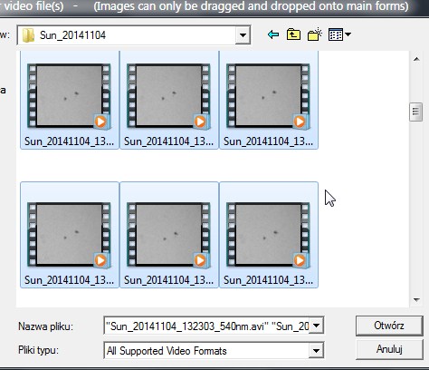Otwieramy właściwy plik z aktywnym obszarem Słońca. Warto otworzyć od razu całą serię plików z obserwacji. Program ma bowiem możliwość przetwarzania wsadowego.