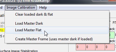 Z menu Image Calibration wybieramy pozycję Load Master Dark i Load Master Flat. Wczytujemy przygotowane wcześniej pliki. Dane z nich będą odjęte od naszych plików z obserwacji.