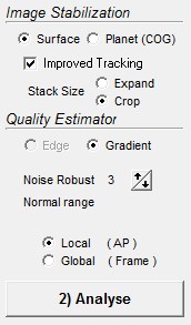 W opcjach Image Stabilization należy zaznaczyć Surface – obiekty powierzchniowe jak Słońce czy Księżyc oraz Crop by program przyciął stos. Dane z krawędzi będą i tak bezużyteczne. Noise robust mówi AS2 o stanie obrazu. Dla bardzo dobrych jakościowo plików można wybrać 2 lub nawet 1. W większości przypadków będzie to 3 i więcej. Ostatni przełącznik zarządza jakością i autor program u zaleca ustawić go na Global. Zrobimy tak gdy przez obraz przechodzić będą chmury w naszym przypadku wybraliśmy Local. Więcej o szczegółach ustawień na stronie Link' target='_blank' style='font-weight:bold;'>Link' target='_blank' style='font-weight:bold;'>Link