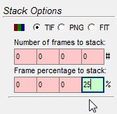 Wybieramy format TIF naszego przyszłego pliku (FIT nie działa jeszcze dobrze w tej wersji). Dalej zielono różowe pola są bardzo ważne zdefiniujemy w nich jaka część materiału będzie wzięta do złożenia w obraz końcowy – od 10% do 80%. Ograniczenie słabych klatek poprawi jakość końcową naszego zdjęcia.