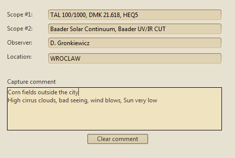 Wypełnienie raportu nie powinny być problemem. Podajemy nasze dane i miejsca obserwacji. Dane o sprzęcie i stosowanych filtrach. Czas rozpoczęcia i zakończenia sesji obserwacyjnej oraz strefę czasową w jakiej pracowaliśmy. Warto pracować w czasie UT, wtedy nie ma problemów z koordynacją czasów. Wklejamy link do katalogu na naszym dysku sieciowym. Mamy też możliwość przesłania 1 zdjęcia z naszej sesji z umieszczonymi na nim danym o nas i samej obserwacji. Plik ten musi być w akceptowanym formacie JPG lub PNG. Możemy też przesyłać opis do umieszczenia na specjalnym forum F-Chroma.