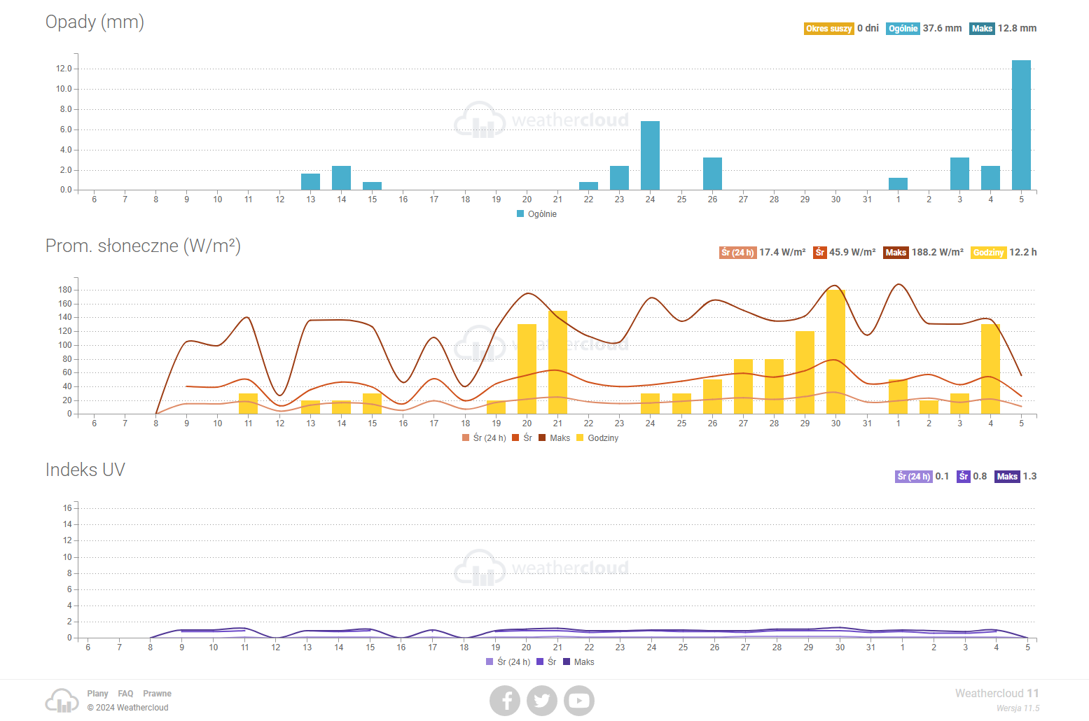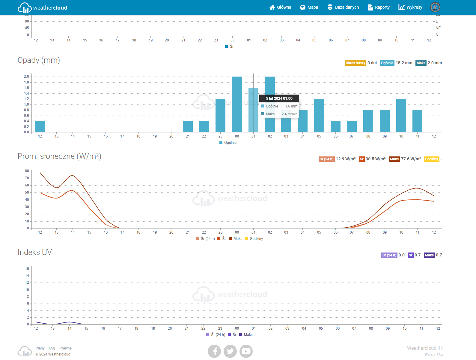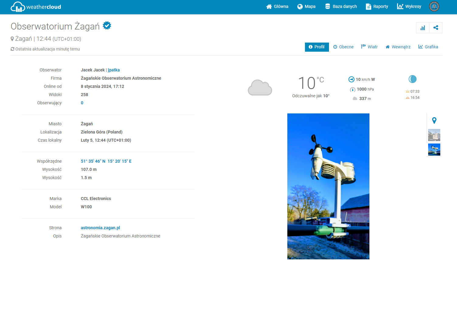 W styczniu 2024 roku uruchomiliśmy stacje meteorologiczną. Stacja stanowi kolejny element funkcjonalności Obserwatorium Astronomicznego. Dane pobierane ze stacji są prezentowane na jednym z dwóch serwisów dedykowanych do ich gromadzenia i prezentowania w postaci strony WWW oraz udostępniania nam ich do dalszej analizy.Stacja pogody wykonuje pomiary: temperatury i wilgotności względną powietrza (%), prędkości wiatru i jego kierunku, ciśnienia atmosferycznego (hPa), nasłonecznienia (W/m2) i promieniowania UV (indeks UV) oraz opadów atmosferycznych (deszczu). Jednostki do wyświetlania użytkownik może ustawić indywidualnie dla siebie, zależnie od potrzeby czy regionu świata, a system sam je przeliczy. W ten sposób można zmienić wyświetlania temperatury ze stopni Celsiusa na stopnie Farenheita czy prędkość wiatru w metrach lub kilometrach na jednostkę czasu.