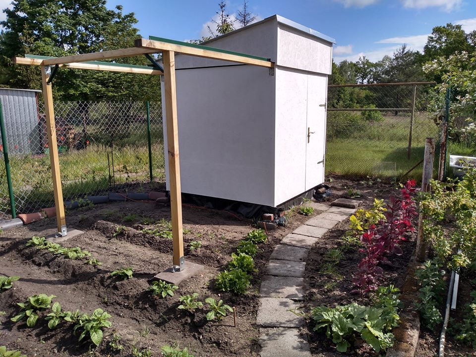 W czasie budowy nawiedziły nas silne wiatry i wichury. To spowodowało, że utwierdziliśmy się w przekonaniu, że przy takich wiatrach stracić dach można bardzo łatwo. Jego kształt pomoże nam bronić się przed takimi atakami wiatru, które zdarzają się co najmniej raz do roku. Dach jest pochyły na północny zachód skąd wieje najsilniej. Jest pochylony na 30 stopni. To sporo i zasłania przez to fragment nieba. Ale dzięki temu wiatr dociska go do budynku a nie unosi jak skrzydło. Aby zaradzić problemowi przesłaniania nieba (tylko w niewielkim stopniu) dach odjeżdża dość daleko. A na wiosnę powstanie druga część torowiska. Da to możliwość odsunięcia dachu w druga stronę i całkowitego odsłonięcia tej części nieba. Co prawda w tym kierunku stoi 9 metrowy dom i zasłania on najbardziej zaświetloną część osiedla, ale bywa i tak, że rolę odkrywają nawet takie ograniczenia. Jest na to rada więc zostanie wdrożona.