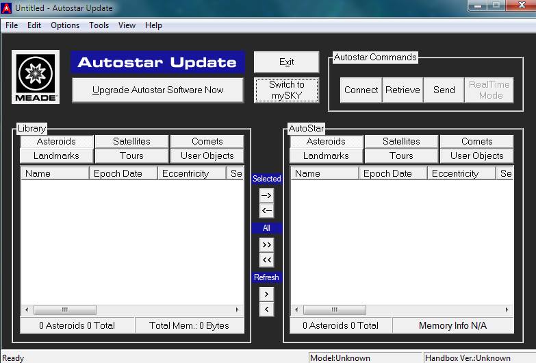 Aktualizacja oprogramowaniaMożemy to wykonać co najmniej na dwa sposoby. Pierwszy jest dostępny przez podłączenie teleskopu do komputera z dostępem do internetu przez kabel USB. W oprogramowaniu ASU Autostar suite wybieramy naciśnięciem przycisku Upgrade rozpoczniemy aktualizację - połączanie z teleskopem musi być nawiązane, co widać będzie na pasku statusu tego okna gdzie widać będzie nazwę naszego modelu sprzętu.