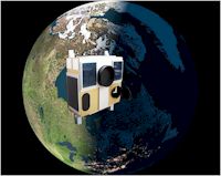 Rys. 1. Oto jak wygląda MOST. 15-cm teleskop jest umieszczony poziomo w dolnej części satelity i patrzy na niebo przez peryskop (45-stopniowe lustro) z otwartym tutaj zabezpieczeniem przeciwsłonecznym. Prostokąt z zaokrąglonymi końcami z lewej strony to element pasywnego chłodzenia CCD. Brzegi satelity i cała druga, oświetlona przez Słońce strona, są pokryte bateriami słonecznymi. Małe, wystające elementy to magnetometry systemu stabilizacji i anteny. Wyraźny, duży, czarny pierścień nie jest ciekawym elementem: to zaczep mocowania do rakiety podczas startu