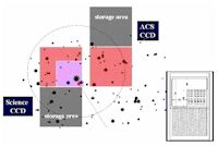 Rys. 2. Płaszczyzna ogniskowa MOST-a z zaznaczona strzałką pozycja Procyona podczas obserwacji. Teleskop daje dobre obrazy w okręgu o średnicy około 1 stopnia. Dwa detektory CCD są tego samego typu i oba działają przez szybki transfer ładunków do zasłoniętej części (kolor ciemnoszary), skąd są wolniej sczytywane. CCD do orientacji satelity (zaznaczony jako ACS; ekspozycje 1-sekundowe) przestał działać na wiosnę 2006 r. na skutek uderzenia przez superenergetyczny promień kosmiczny. Od tego czasu naukowy CCD używa gwiazdy w polu bezpośrednich obrazów w kształcie odwróconej litery L, a ekspozycje nie mogą być dłuższe od 2–3 sekund. Macierz 6×6 mikrosoczewek zasłania część tego detektora