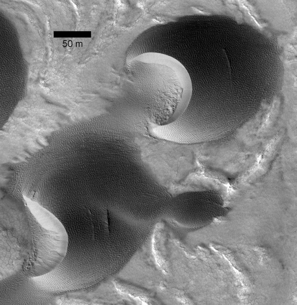 Są to wydmy na Marsie - na powiększeniu zobaczymy skalę odwzorowania. Zdjęcie ukazuje piaskowe wydmy w okolicach bieguna północnego Marsa. Między innymi wskutek wpływu zestalonego dwutlenku węgla, te formacje pozostają w zupełnym bezruchu, w przeciwieństwie do ich ziemskich odpowiedników. Obraz jest wycinkiem zdjęcia PSP_001374_2650 z kamery HiRISE sondy Mars Reconnaissance Orbiter.