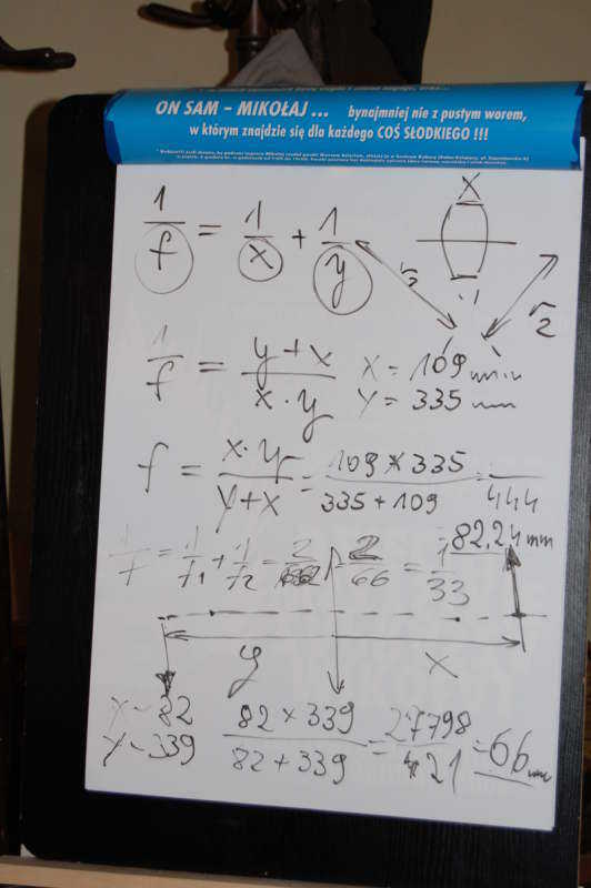 Do tego doświadczenia zastosowaliśmy przygotowany przyrząd pozwalający zmierzyć doświadczalnie niezbędne parametry do wyliczenia ogniskowej. W celu obliczenia tej cechy soczewki wykorzystaliśmy równanie soczewki. Co prawda zarówno pomiary jak i obliczenia są obarczone nieznacznym błędem. Chociażby taki, że soczewka nie jest wystarczająco cienka by w pełni zastosować te obliczenia. Ale to wystarcza w zupełności do ustalenia naszej konstrukcji.