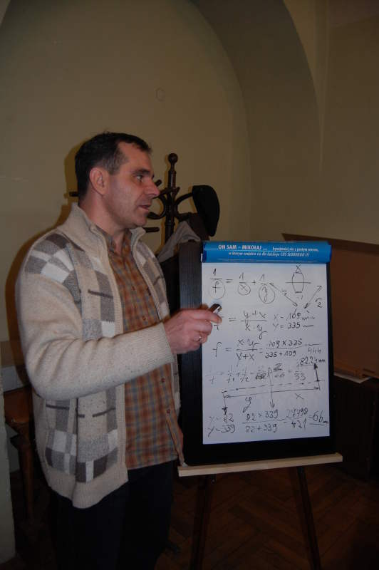 Galileoskopu, tzn. ma go już w swoich rękach. Przedstawił nam go na naszych zajęciach, co pozwoliło na zapoznanie się z nim. Nie mieliśmy do tej pory okazji na poznanie tej konstrukcji osobiście. Jak się okazało nie taki diabeł straszny. Teleskop daje się całkowicie rozebrać na części o poznać jego wewnętrzną budowę. Można go również rozbudować o soczewkę wydłużająca ogniskową zwaną berlowem. Dzięki niej powiększenie wzrasta dwukrotnie.