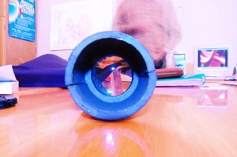 Synta 10” i mamy nadzieję powitać ją w naszych szeregach już w tym tygodniu. Nie pozostajemy jednak bezczynni i nasi członkowie mają już pierwsze efekty pracy nad swoimi konstrukcjami teleskopów soczewkowych. Jak niesamowite potrafią być to konstrukcje niech ocenią czytelnicy sami. Choć naprawdę trzeba to zobaczyć na własne oczy by zrozumieć jak bujną wyobraźnie mają miłośnicy astronomii z Żagania. Autorami tego rozwiązania są Sebastian i Michał (tato i syn).