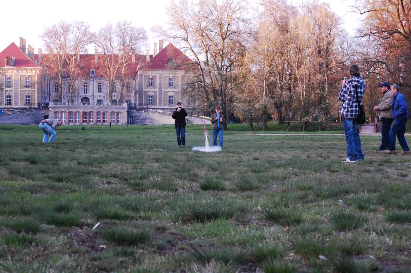 Zajęcia rozpoczęliśmy jak zwykle dyskusją kosmologiczną, wyjaśnieniem wielu zagadnień astronomicznych, porównaniami sprzętu i ostatnimi pracami nad Tytanem1 – naszą rakietą. Prace jedynie kosmetyczne więc start zaplanowany na 19:00 nie uległ przesunięciu. Miejsce startu zostało wyznaczone na wyspie Bażanciarni. Pogoda piękna, bezwietrznie wokoło widzów co niemiara jak to na startach rakiet kosmicznych. Dzielnymi kosmonautami zostali: Stefan, Rafał, Bartłomiej, Kuba , Wojtek, Patryk, Szymon oraz Jarosław i Michał - kobiet w tym dniu zabrakło. Wszyscy ledwo się zmieścili. Kierownikiem misji i operatorem procesu startowego był Jacek.