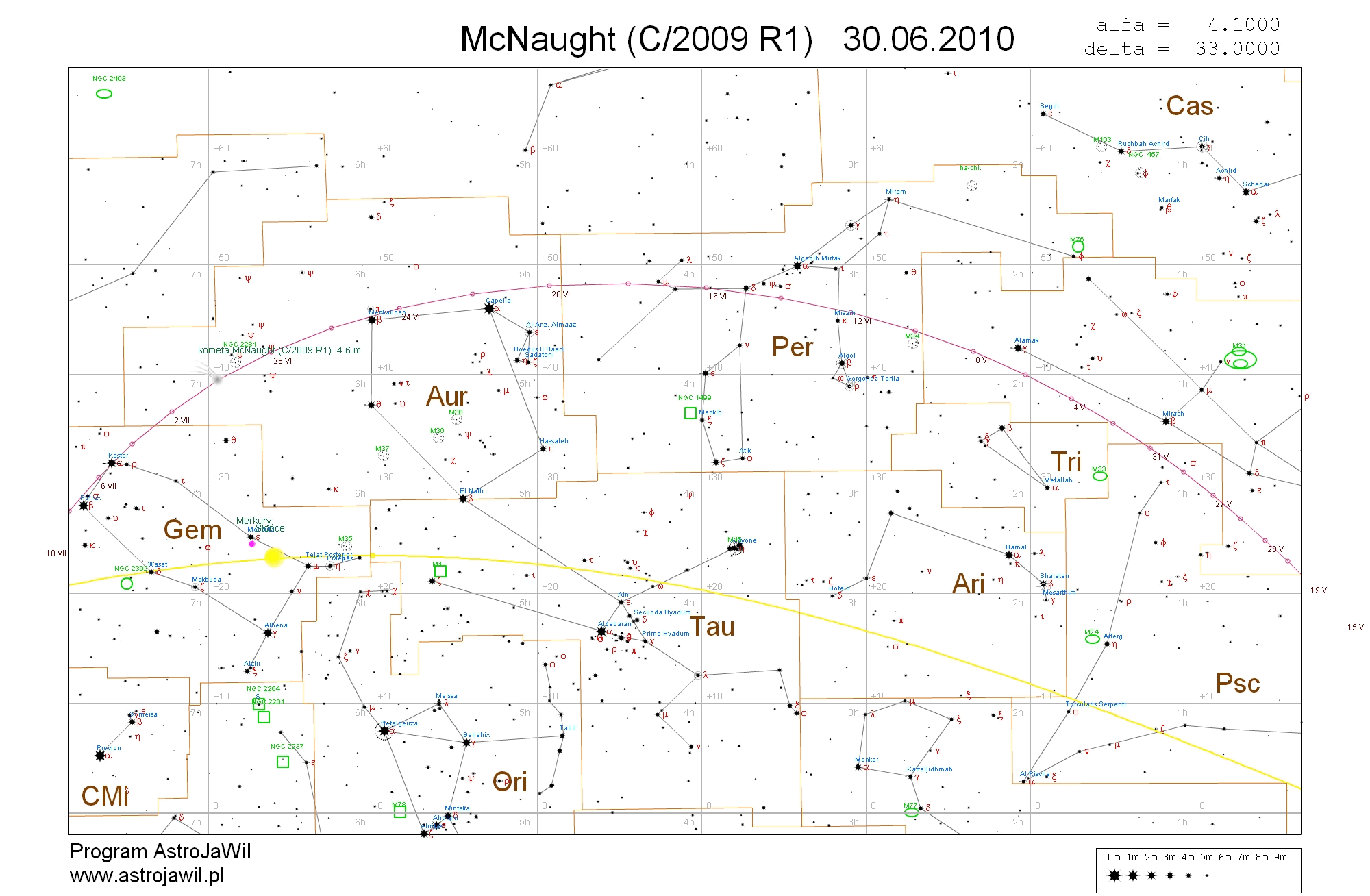 Tym razem kometa jest dostępna w gwiazdozbiorze Perseusza. I najlepiej ją obserwować jest nad ranem nad wschodnim horyzontem. Rano za to mamy dobry seeing, który przyda nam się przy małej wysokości obiektu nad widnokręgiem. Noc krótka i coraz cieplejsza pomoże dotrwać do rannych obserwacji. Przeszkodzi tylko jasne letnie niebo bo obiekt jest obiektem rozmytym.