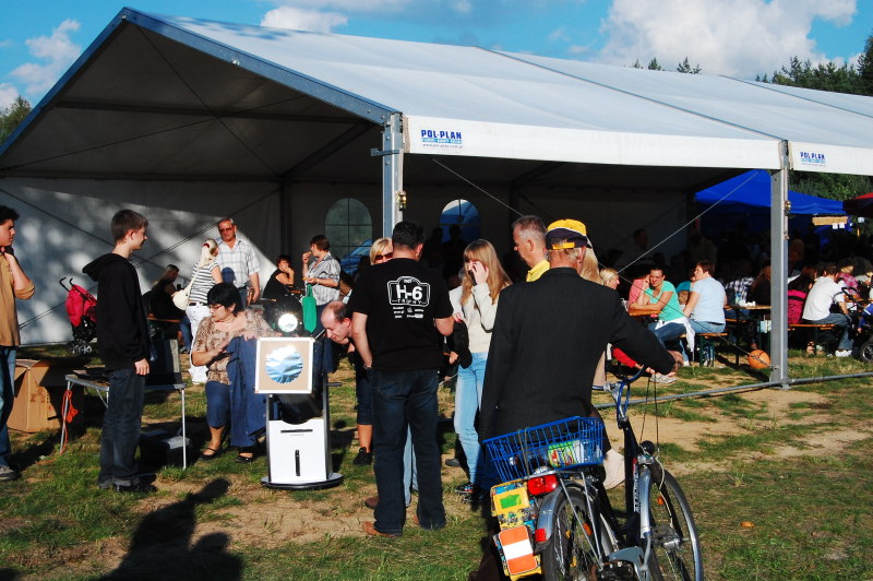 Kiełbaski wyszły wyśmienite, tym bardziej, że przyrządzała je sama Pani Joanna – ma Kobieta rękę do ognia. I choć sama impreza trwała od przedpołudnia, to szybko zostaliśmy namierzeni przez ciekawych żaganian, którzy ochoczo ustawili się w kolejce do naszej nieziemskiej armaty, by podglądać sekrety Słońca. A było co podglądać. Na brzegu tarczy pojawiła się ciekawa plama słoneczna, a dzięki pociemnieniu brzegowemu można było dostrzec bez trudu piękne pochodnie fotosferyczne. Zjawisko było obserwowane przez wszystkich dzięki zaopatrzeniu teleskopu w specjalny filtr z Mylaru, który wystarczająco zmniejsza ilość transmitowanego światła, by można było bezpiecznie obserwować światło gwiazdy.