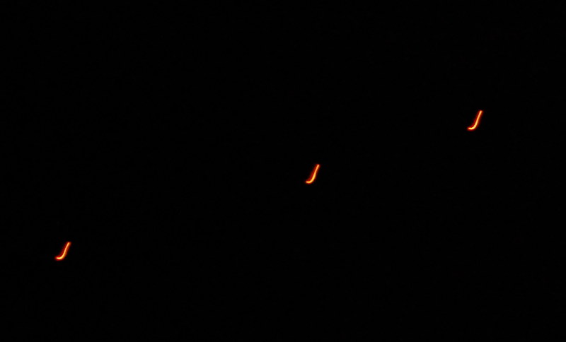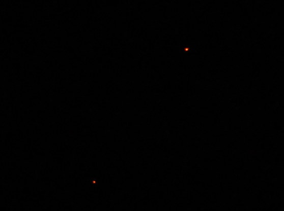 Szybko robiło się zimno. Pomimo tego nikt nie chciał rezygnować z podziwiania nieba pełnego gwiazd. Udało nam się zaobserwować satelitę IRYDIUM, mimo, że na to nie przygotowywaliśmy się. Ale największym zaskoczeniem było dla wszystkich UFO. Na niebie tak jak widać na zdjęciach Bartka, przemierzały szlak kolejne świecące obiekty. Po krótkim zastanowieniu się doszliśmy do wniosku, że sa to lampiony wypuszczane z okazji uroczystości w Willa Park. Co potwierdziła wkrótce nasza koleżanka dzwoniąc do swoje mamy, która tam pracuje. W tym momencie UFO przestało być niezidentyfikowane. Zaskoczyła nas jednak prędkość poruszania się lampionów, była nadzwyczaj duża w stosunku do znikomego wiatru na naszej wysokości.