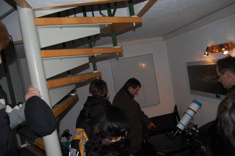 Samo obserwatorium jest tez bardzo dobrze przygotowane. Pan Sternwart sam budował je przez okres 3 lat. Kopuła waży około 1300kg i jest wykonana wg projektu berlińskiego. Pamiętajmy, że w czasach przedwojennych Niemcy, w tym Berlin, były stolicą astronomii światowej. Kopuła jest oczywiście obrotowa sterowana z systemu kierowania teleskopem. Teleskop to 10” reflektor w systemie Cassegrain. Wyposażony w binokular umożliwia wygodną obserwację planet oraz po wyposażeniu w kamerę daje możliwość fotografowania obiektów kosmicznych. W obserwatorium znajduje się też 20” teleskop zwierciadlany w systemie Newtona. Ten jednak jest na montażu typu Dobson. Konstrukcja teleskopu jest kratownicowa. Co znacznie ułatwia transport do miejsc pokazów nieba. Teleskop jest własnością Stowarzyszenia. Wykonali go członkowie własnoręcznie. Optykę zakupiono, a całą pozostałą konstrukcję wykonano we własnych warsztatach.