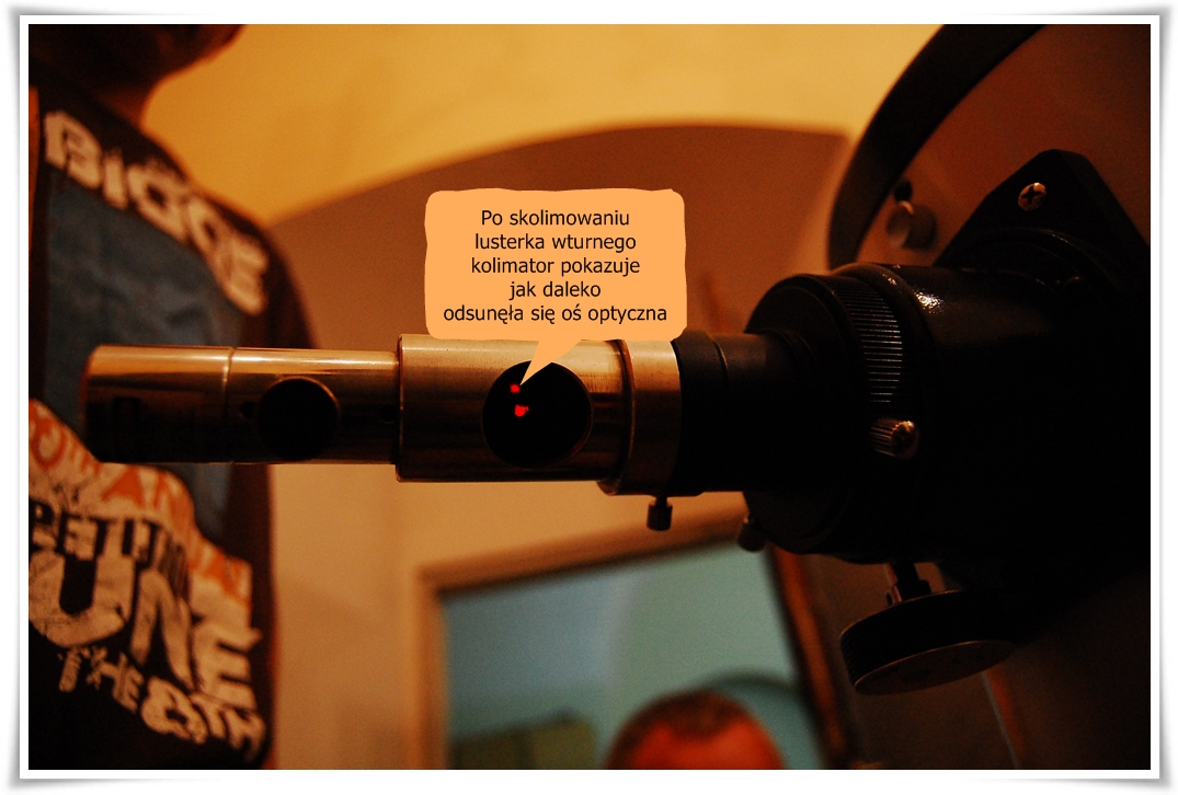 - Po zamontowaniu kolimatora i odblokowaniu lustra w wyciągu, ustawiliśmy lustro wtórne śrubami regulacyjnymi tak, by światło lasera znalazło się w znaczniku kontrolnym na środku lustra. Świecące punktu w kolimatorze nieznacznie się rozjechały, ale to normalne. Teraz śrubami kolimacyjnymi na spodzie celi ustawiliśmy znak w kolimatorze tak by oba punkty się pokryły.