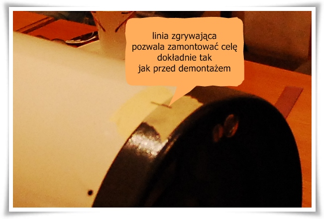 - Teraz musimy nanieść znaki na tubie i celi, by przy ponownym składaniu teleskopu zamontować ją dokładnie w takie samo miejsce jak była przed demontażem.