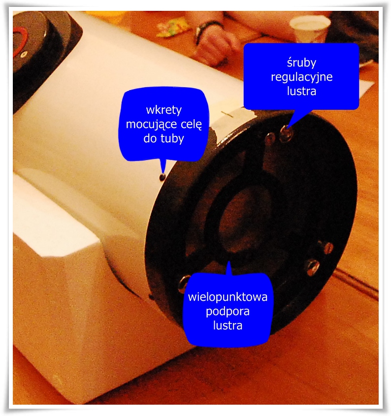 jest po wierzchniej jego stronie. Jest ona cienka i łatwo ją uszkodzić. Drobne uszkodzenia nie stanowią problemu, jeśli nie są zbyt liczne. W czasie obserwacji wizualnych nie spowodują zakłóceń. Ale przy astrofotografii mogą wpływać na jakość obrazu. W razie potrzeby lustro można oddać do ponownego napylenia. W naszym przypadku wysłalibyśmy je do Wrocławia – do Astroptyki. My jeszcze z tym zaczekamy.