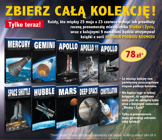 Wydawnictwo Pruszyński i Spółka przygotowały kolejną gratkę dla fanów kosmonautyki i kolekcjonerów. Oto historia największej przygody ludzkości, historia podboju kosmosu. Z kolejnymi numerami wydań Wiedzy i Życia, będzie można nabyć wraz z przewodnikami przedstawiającymi całą naszą drogę ku gwiazdom.