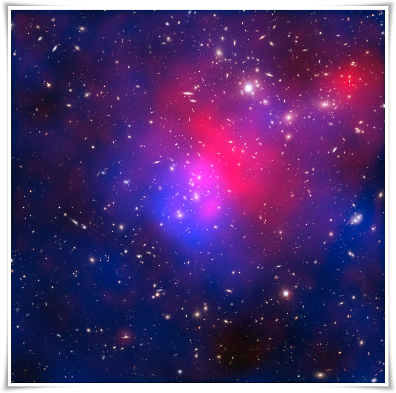 Galaktyki w gromadzie można dostrzec na zdjęciach z VLT i Hubble'a. Mimo, że są jasne, odpowiadają jedynie za 5% masy gromady. Resztę stanowi gaz (około 20%), który jest tak gorący, że świeci jedynie w promieniowaniu rentgenowskim oraz ciemna materia (około 75%), która jest całkowicie niewidzialna. Aby zrozumieć co zaszło podczas zderzenia zespół astronomów musiał wykonać mapę rozmieszczenia wszystkich trzech typów materii.