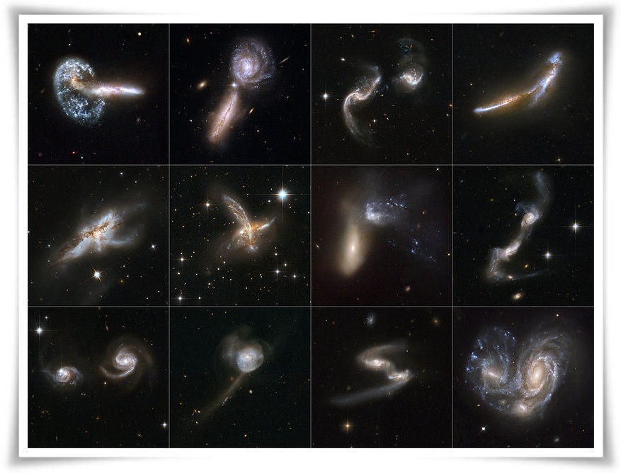Zderzenia galaktyk dają fantastyczne obrazy. Zderzające się galaktyki przenikają się nawzajem. Grawitacja wyhamowuje je dopiero po zderzeniu. W zasadzie przelatują przez siebie nie napotykając oporu. Ale jądra galaktyk zaczynają obiegać wspólne centrum, by po milionach lub miliardach lat doprowadzić do połączenia się, zlania, dwóch czarnych dziur. Samo ich połączenie trwa ułamek milisekundy. Emitowana jest ogromna ilość energii, tak, że nowa galaktyka staje się na nowo jasnym kwazarem. To jakby druga młodość lub narodziny nowej jeszcze większej galaktyki. A wszystko w rodzi się w pięknym tańcu materii.